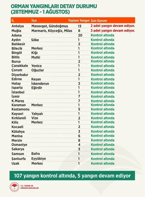 Son dakika haberleri... Tarım ve Orman Bakanı Bekir Pakdemirli sevindiren bilgiyi paylaştı ve "28 Temmuz-1 Ağustos 2021 tarihleri arasında çıkan 112 orman yangınının 107'sini kontrol altına aldık. Devam eden 5 yangını kontrol altına alma çalışmalarımız aralıksız devam ediyor." dedi.