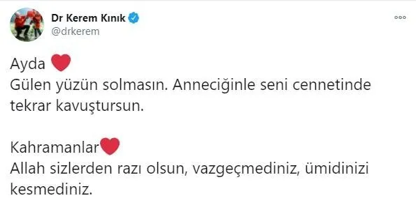 Kızılay Başkanı Kerem Kınık yaptığı Twitter paylaşımında, "Ayda, Gülen yüzün solmasın. Anneciğinle seni cennetinde tekrar kavuştursun. Kahramanlar, Allah sizlerden razı olsun, vazgeçmediniz, ümidinizi kesmediniz." diyerek Ayda'nın annesinin ölüm haberlerini doğruladı.