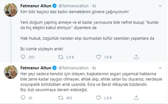 TÜRGEV Yönetim Kurulu Başkanı Fatmanur Altun: Kim bilir kaçıncı kez kadın derneklerini göreve çağırıyorum! Yeni doğum yapmış anneye ve el kadar yavrusuna bile nefret kusup "bunlar da hiç eleştiri kabul etmiyor" diyenlere de Hak-hukuk, özgürlük naraları atıp durmadan küfür seansları yapanlara da İki cümle söyleyin artık! Her şeyi sadece kendisi için isteyen, başkalarının asgari yaşamsal haklarına bile zerre kadar saygısı olmayan, ahlak alıp, ahlak satan bu duyarsız, nerdeyse sosyopatik kötülükten artık usandık. Esra ve Berat Albayrak bizdendir. Biz, bizi savunmaya devam edeceğiz.