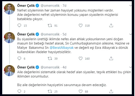 AK Parti sözcüsü Ömer Çelik: Nefret söyleminin her zaman haysiyet yoksunu müşterileri vardır. Aile değerlerini nefret söyleminin konusu yapan siyasilerin müşterisi bataklıkta çıkıyor. Bu siyasilerin ürettiği iklimde nefes alan ahlak yoksunlarının yeni doğan masum bir bebeği hedef alarak, Sn Cumhurbaşkanımızın ailesine, Hazine ve Maliye Bakanımız Sn @BeratAlbayrak ve değerli eşi Esra Albayrak'a dönük kullandıkları ifadeler haysiyetsizliktir. Aile değerlerini sistematik olarak hedef alan siyasiler, teşvik ettikleri bu çirkin iklimden sorumludur. Biz aile değerlerinin haysiyetini savunmaya devam edeceğiz.