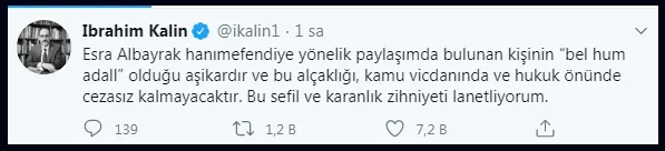 Hazine ve Maliye Bakanı Berat Albayrak ve eşi Esra Albayrak, dördüncü bebeklerini kucağına aldıklarını duyurmaları ardından ağır hakaret ve iftiralara maruz kalmıştı. Albayrak ailesine yönelik yapılan çirkin saldırıya bir tepki de Cumhurbaşkanı Sözcüsü İbrahim Kalın'dan geldi. Kalın, "Bu alçaklığı, kamu vicdanında ve hukuk önünde cezasız kalmayacaktır. Bu sefil ve karanlık zihniyeti lanetliyorum" dedi.