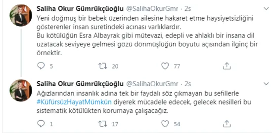 KADEM Yönetim Kurulu Başkanı Saliha Okur Gümrükçüoğlu yaptığı paylaşımda: Yeni doğmuş bir bebek üzerinden ailesine hakaret etme haysiyetsizliğini gösterenler insan suretindeki acınası varlıklardır. Bu kötülüğün Esra Albayrak gibi mütevazi, edepli ve ahlaklı bir insana dil uzatacak seviyeye gelmesi gözü dönmüşlüğün boyutu açısından ilginç bir örnektir. Ağızlarından insanlık adına tek bir faydalı söz çıkmayan bu sefillerle #KüfürsüzHayatMümkün diyerek mücadele edecek, gelecek nesilleri bu sistematik kötülükten korumaya çalışacağız.