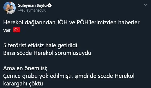 Bakan Soylu, Twitter hesabından yaptığı açıklamada, "5 terörist etkisiz hale getirildi Birisi sözde Herekol sorumlusuydu Ama en önemlisi; Çemçe grubu yok edilmişti, şimdi de sözde Herekol karargahı çöktü." dedi.
