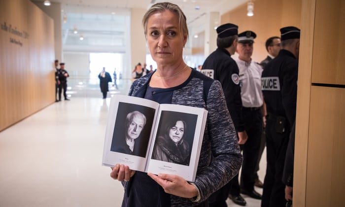 Fransız pulmonologu Irene Frachon, Paris adliyesinde bir duruşmanın açılış gününde arabulucunun kurbanlarının portreleriyle birlikte bir poz veriyor.