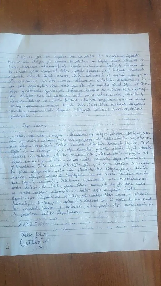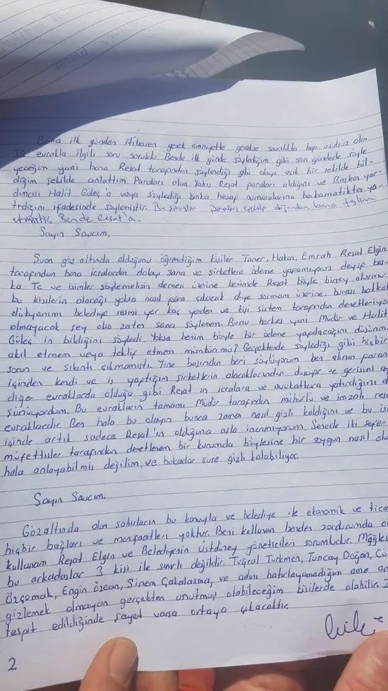 "Daha önce bana sorduğunuz alacaklarımı ve aldığım paraları gösteren çetelemi cezaevinde olmam münasebetiyle geç de olsa buldum. Yazılan rakamlar benim aldığım rakamlardır. Tarihleri ve banka dekontları karşılaştırıldığında Reşat Elgin'in ve belediyenin geri alıp zimmetine geçirdiği paralar tespit edilmelidir.