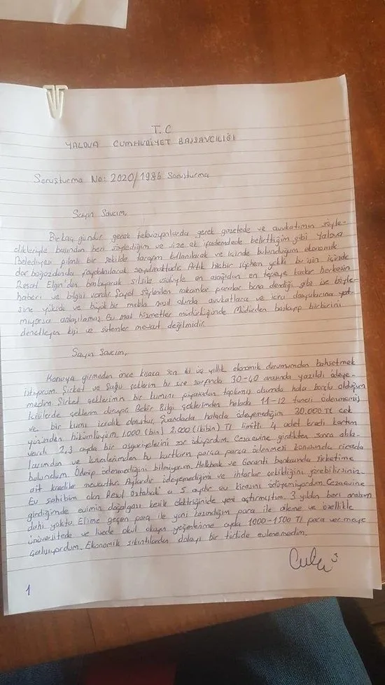 Bekir Bilgi'nin, 27 Şubat 2020 tarihinde Yalova Cumhuriyet Başsavcılığı'na gönderdiği dört sayfalık mektupta şu ifadeler yer alıyor: