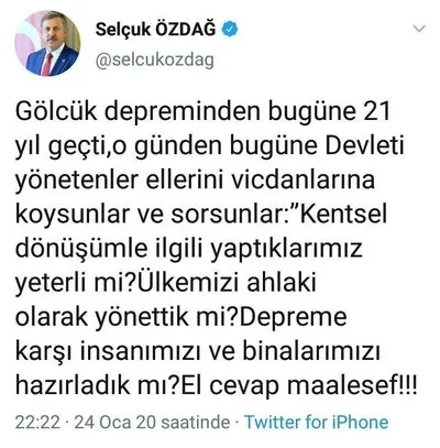 MHP'den ihraç edilen eski milletvekili Sinan Oğan ve gazeteci Ceyda Karan deprem vergilerini gündeme getirdi. Gelecek Partisi Genel Başkan Yardımcısı Selçuk Özdağ, deprem sonrası "Gölcük depreminden bugüne 21 yıl geçti, o günden bugüne Devleti yönetenler ellerini vicdanlarına koysunlar ve sorsunlar: "Kentsel dönüşümle ilgili yaptıklarımız yeterli mi?Ülkemizi ahlaki olarak yönettik mi?Depreme karşı insanımızı ve binalarımızı hazırladık mı?El cevap maalesef!!!" diye yazdı. Daha deprem yeni olmuş ve enkaz altında kalanlar varken siyaset yapılmasına ve bundan nemalanmaya çalışılmasına vatandaşlar tepki gösterdi.