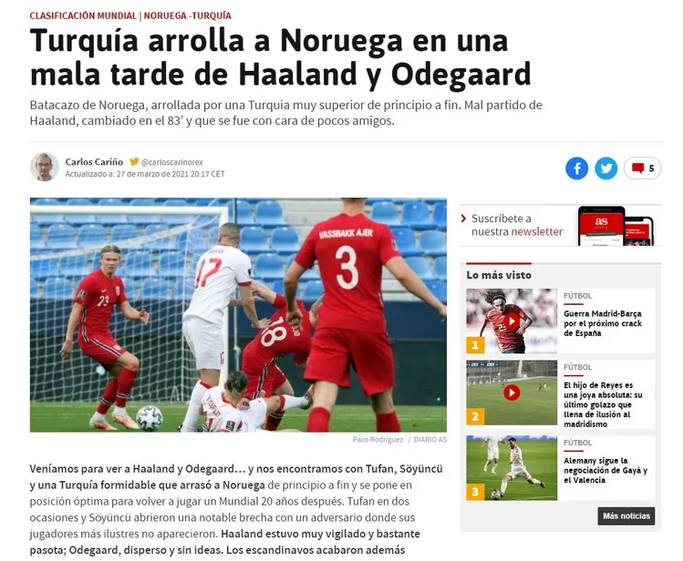 2022 FIFA Dünya Kupası Avrupa Elemeleri G Grubu'nda İspanya'daki maçta Norveç'i 3-0 yenen A Milli Takım'ın galibiyeti, İspanyol basınında geniş yer buldu. Marca gazetesi, "Türkiye, Haaland ve Odegaardlı Norveç'i La Rosaleda'ya gömüyor." başlığını atarak, "Türkler durdurulamaz şekilde yoluna devam ediyor." yorumunu yaptı.