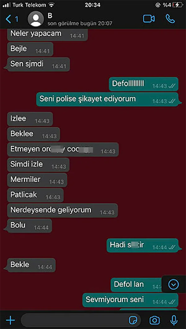 Son dakika haberi: İstanbul'da ayrıldığı eski sevgilisinden ölüm tehdidi alan üniversite öğrencisi Elvan Koç çareyi polise gitmekte buldu. Ayrılığı hazmedemeyen eski sevgili bu ayrılıktan sorumlu tuttuğu Elvan Koç'un çocukluk arkadaşını da kezzap atıp yakmakla tehdit etti. Elvan Koçtun saplantılı sevgili kabusu! "Güzelliğine güvenme seni kezzapla yakarım" diye mesaj atan saplantılı sevgilinin reddedildikten sonra yazdığı şoke eden diğer mesajlar da ortaya çıktı. İşte çarpıcı son dakika haberinin tüm ayrıntıları