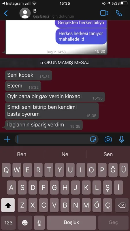 Gözlerimin önünde kendini kesti eğer barıştım kelimesini duymazsa devam edeceğini kendisini kestikten sonra beni bıçaklayacağını söyledi. Ya katilin olacağım ya da benim olacaksın gibi deli saçması tehditler etti. En son şehir değiştirdim ve orda ayrıldığımı söyledim. Pusuda yattığını evime gelir gelmez öldüreceğini söyledi. Avukatım şikayette bulundu" ifadelerini kullandı.