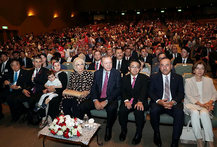 Bugün buraya gelemeyen Japonya'daki tüm kardeşlerime bütün vatandaşlarıma selamlarımı gönderiyorum. Sizlere aileleriniz, yakınlarınız, hemşerilerinizin kucak dolusu selamını muhabbetini getirdim. Ana vatandan binlerce km uzakta gurbeti sılaya çeviren tüm kardeşlerime buradan selamlarımı iletiyorum. Öncelikle şu hususu bir kez daha sizlere hatırlatmak istiyorum.