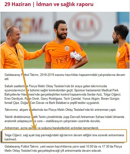 Galatasaray resmi internet sitesinden de Tolga Ciğerci'nin mazeret göstererek idmana gelmediği açıkça belirtildi. Sarı-kırmızılıların sitesinde, "Tolga Ciğerci, sağ ayak baş parmağındaki ağrılarının devam ettiğini öne sürerek antrenmana katılmadı." ifadeleri kullanıldı.