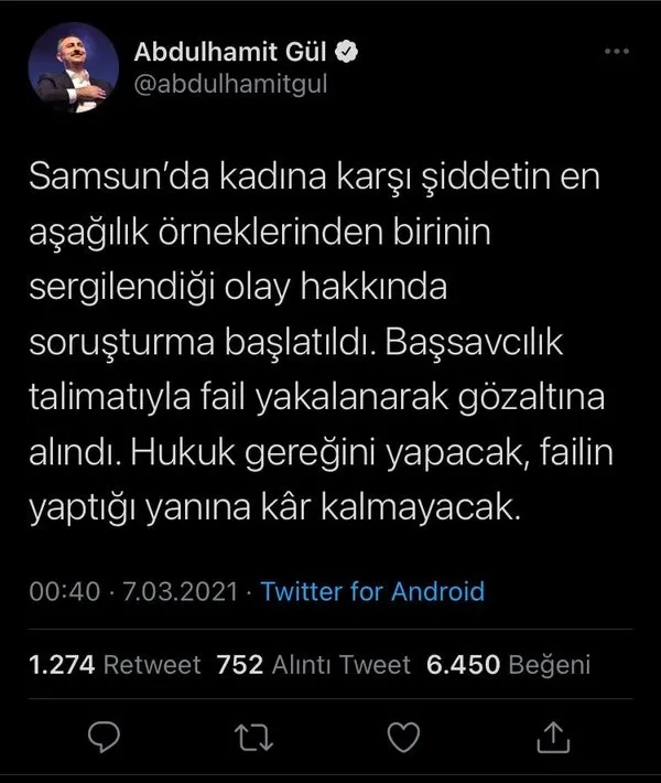 Öte yandan konuyla ilgili olarak Adalet Bakanı Abdulhamit Gül; "Samsun'da kadına karşı şiddetin en aşağılık örneklerinden birinin sergilendiği olay hakkında soruşturma başlatıldı. Başsavcılık talimatıyla fail yakalanarak gözaltına alındı. Hukuk gereğini yapacak, failin yaptığı yanına kâr kalmayacak" açıklamasını yaptı.