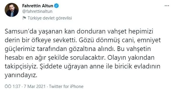 İletişim Başkanı Fahrettin Altun, sosyal medya hesabından yaptığı açıklamada "Samsun'da yaşanan kan donduran vahşet hepimizi derin bir öfkeye sevketti. Gözü dönmüş cani, emniyet güçlerimiz tarafından gözaltına alındı. Bu vahşetin hesabı en ağır şekilde sorulacaktır. Olayın yakından takipçisiyiz. Şiddete uğrayan anne ile biricik evladının yanındayız." ifadelerini kullandı.