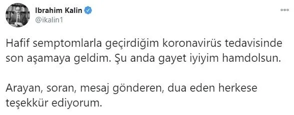Cumhurbaşkanlığı Sözcüsü Kalın, Twitter hesabından yaptığı açıklamada, "Hafif semptomlarla geçirdiğim koronavirüs tedavisinde son aşamaya geldim. Şu anda gayet iyiyim hamdolsun. Arayan, soran, mesaj gönderen, dua eden herkese teşekkür ediyorum" dedi.