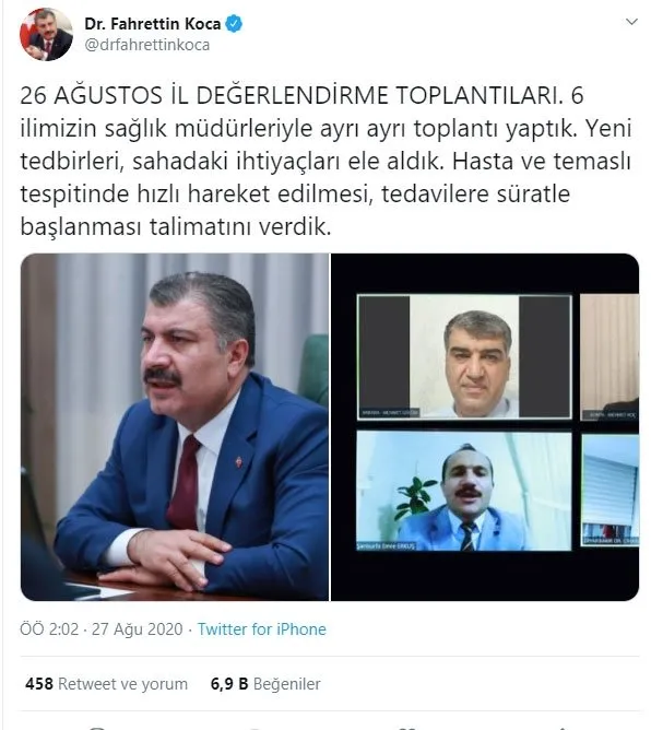 Sağlık Bakanı Fahrettin Koca, 6 ilin sağlık müdürleriyle video konferans yöntemini kullanarak İl Değerlendirme Toplantısı gerçekleştirdi. Toplantı sonrası açıklama yapan Sağlık Bakanı Koca, yeni tedbir ve sahadaki ihtiyaçlar konusunda bilgilendirme yaptı. Koca, hasta ve temaslı tespitinde hızlı hareket edilmesi için de talimat verdi.