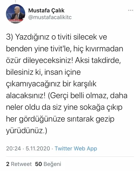 "Yazdığınız o tweeti silecek ve benden yine tweetle, hiç kıvırmadan özür dileyeceksiniz! Aksi takdirde, bilesiniz ki, insan içine çıkamıyacağınız bir karşılık alacaksınız! (Gerçi belli olmaz, daha neler oldu da siz yine sokağa çıkıp her gördüğünüze sırıtarak gezip yürüdünüz.)"