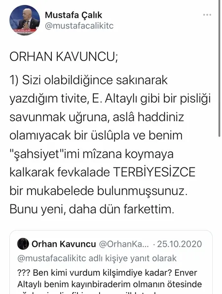 "Sizi olabildiğince sakınarak yazdığım tweete, Enver Altaylı gibi bir pisliği savunmak uğruna, aslâ haddiniz olamıyacak bir üslûpla ve benim 'şahsiyet'imi mîzana koymaya kalkarak fevkalade terbiyesizce bir mukabelede bulunmuşsunuz. Bunu yeni, daha dün farkettim."