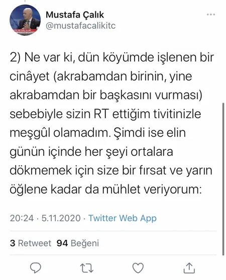 "Ne var ki, köyümde işlenen bir cinâyet (akrabamdan birinin, yine akrabamdan bir başkasını vurması) sebebiyle sizin RT ettiğim tivitinizle meşgûl olamadım. Şimdi ise elin günün içinde her şeyi ortalara dökmemek için size bir fırsat ve yarın (bugün) öğlene kadar da mühlet veriyorum: