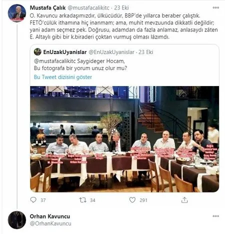 Mustafa Çalık; "Bu fotoğrafa bir yorumunuz olur mu?" şeklindeki soruya; "Orhan Kavuncu arkadaşımızdır, ülkücüdür, BBP'de yıllarca beraber çalıştık. FETÖ'cülük ithamına hiç inanmam; ama, muhit mevzuunda dikkatli değildir; yani adam seçmez pek. Doğrusu, adamdan da fazla anlamaz, anlasaydı zâten Enver Altaylı gibi bir kayınbiraderi çoktan vurmuş olması lâzımdı" ifadelerini kullandı.