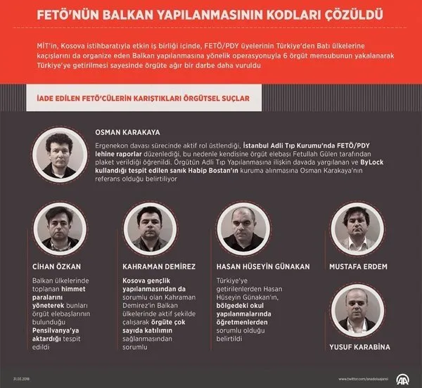 MİT'in Kosova istihbaratıyla iş birliği içinde gerçekleştirdiği operasyonda, Türkiye'de aranan ve aralarında sanıklar Mustafa Erdem ile Yusuf Karabina'nın da bulunduğu FETÖ/PDY'nin 6 üst düzey mensubu yakalanarak 29 Mart 2018'de Türkiye'ye getirilmişti.