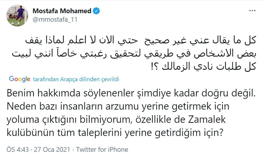 Mısırlı futbolcu gün içinde yaptığı paylaşımla Zamalek yöneticilerine mesaj verdi. Mostafa Mohamed yaptığı paylaşımda, "Benim hakkımda söylenenler doğru değil. Neden bazı insanlar, benim hayallerimin önünde duruyor nedenini bilmiyorum. Özellikle de Zamalek kulübünün istediği bütün şartlar karşılanmışken?!" ifadelerini kullandı. Mohamed'in bu paylaşımı transfer olmak istediği şeklinde yorumlandı.