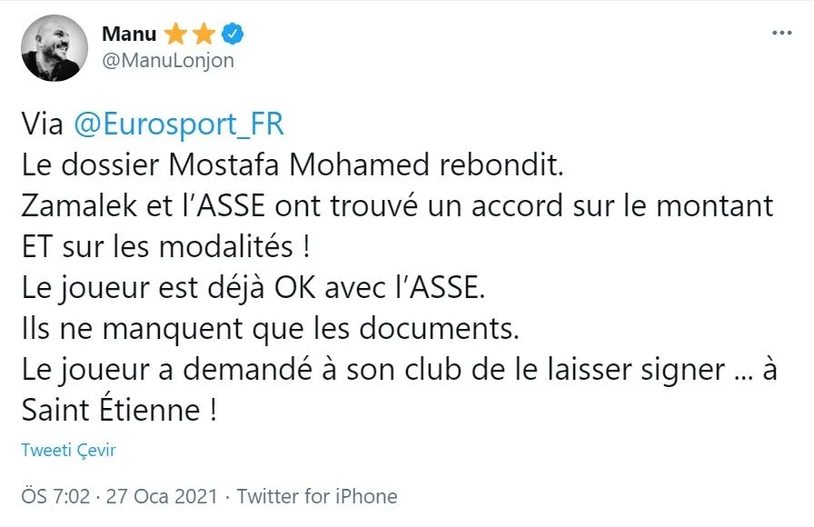 Mostafa Mohamed için Fransa'dan kötü haber geldi. Ünlü gazeteci Manu Lonjon'un sosyal medyada paylaştığı bilgiye göre Zamalek ile Ligue 1 ekibi Saint-Étienne, transfer için anlaşmış durumda. Mohamed ile de anlaşma sağlayan Fransa ekibi, transferi tamamlamak için belgeleri bekliyor. Yine Lonjon'un aktardığı bilgiyen göre Mostafa Mohamed, Saint-Étienne'e gitmek için kulübünden izin istedi.