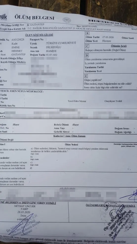 İşte koronavirüs salgını nedeniyle toplu mezar hazırlandığını iddia eden ve internette görüntüler paylaşan Saime Dilsizoğlu'nun annesinin ölüm raporu: