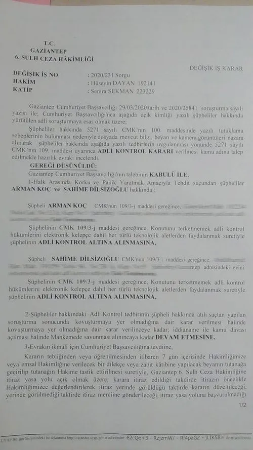 Gaziantep 6. Sulh Ceza Mahkemesi; şüpheli Saime Dilsizoğlu'nun halk arasında korku ve panik yaratmak amacıyla tehdit suçunu işlediği gerekçesiyle evini terk etmemek şeklinde adli kontrol tedbirine tabi tutulmasına karar verdi.