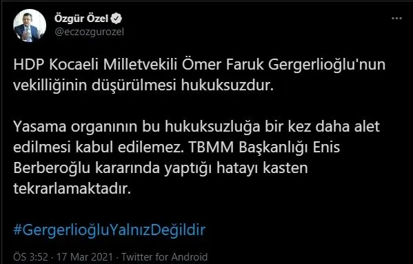 HDP Kocaeli Milletvekili Ömer Faruk Gergerlioğlu'nun vekilliğinin düşmesi sonrası CHP'li Özgür Özel tepki çeken bir paylaşımda bulundu. Özel, kararı 'hukuksuz' olarak nitelendirdi, TBMM'yi hedef aldı.