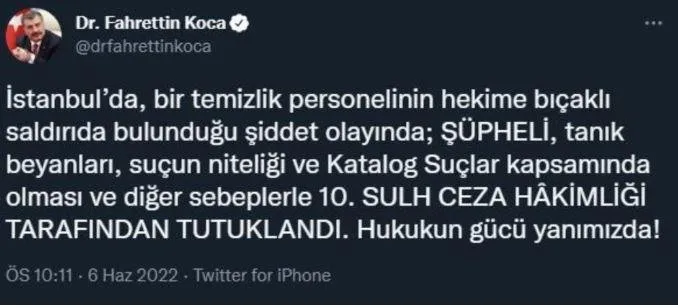 Sağlık Bakanı Fahrettin Koca'nın İstanbul'da doktora hastanede bıçaklı saldırı düzenleyen temizlik görevlisinin tutuklandığını duyurduğu olayın detaylarına SABAH ulaştı. Olay 4 Haziran günü İstanbul Fatih'te bulunan Eğitim ve Araştırma Hastanesinde meydana geldi. 53 yaşındaki Ramazan Ç, hastanede temizlik personeli olarak görev yapıyordu. Olaydan yaklaşık 2-3 ay öncesinde hastanenin COVİD-19 testi için bulunan sürüntü test kabininde çalışan doktor Halit A, dışarıdan küfür sesleri duydu.