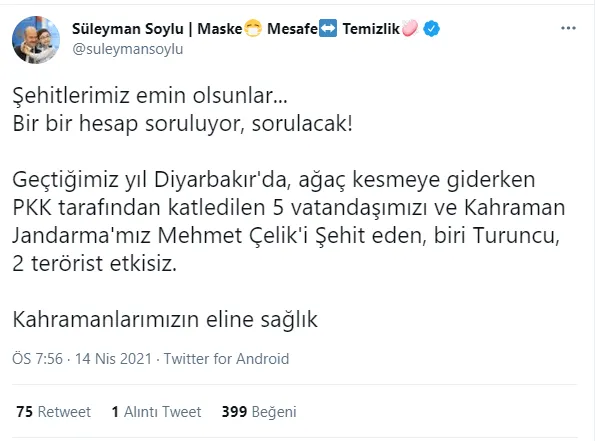 Etkisiz hale getirilen teröristlerden birinin Turuncu kategoride yer alan Dara Zagros kod adlı Abdulsittar Özer olduğu belirlendi. Bölgede operasyon devam ederken İçişleri Bakanı Süleyman Soylu sosyal medya hesabından yaptığı paylaşımda "Şehitlerimiz emin olsunlar... Bir bir hesap soruluyor, sorulacak! Geçtiğimiz yıl Diyarbakır'da, ağaç kesmeye giderken PKK tarafından katledilen 5 vatandaşımızı ve Kahraman Jandarmamız Mehmet Çelik'i şehit eden, biri turuncu, 2 terörist etkisiz. Kahramanlarımızın eline sağlık" dedi.