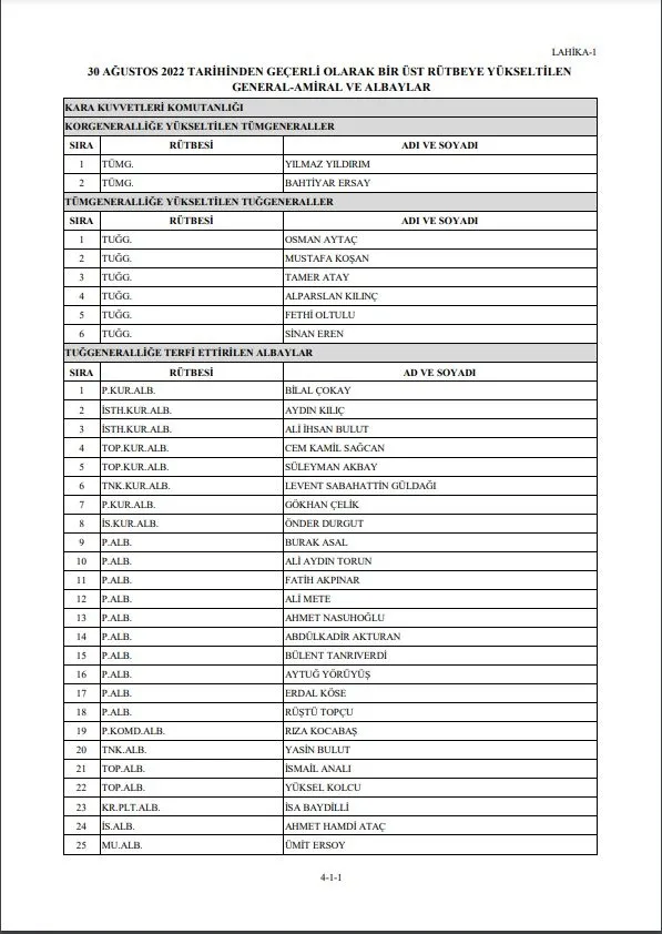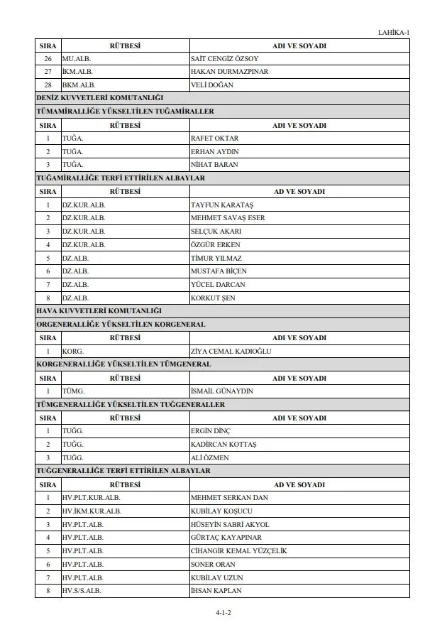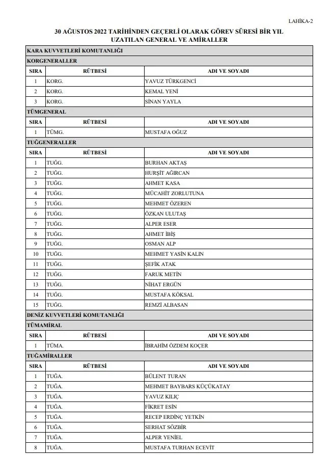 "16 general amiral ve amiral üst rütbeye yükselmiştir. 40 general ve amiralin görev süreleri bir yıl uzatılmıştır. 38 general ve amiral kadrosuzluk sebebiyle emekliye sevk edilmiştir."