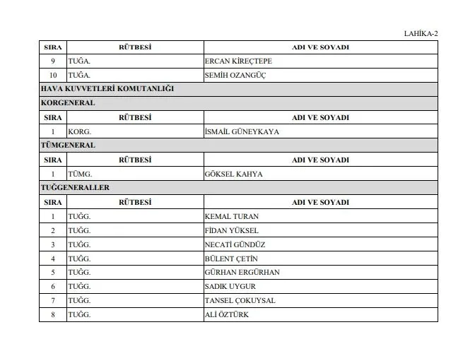 "Orgeneral Yaşar Güler'in yaş haddi ve görev süresi bir yıl uzatıldı. Deniz ve Hava Kuvvetleri komutanları emekliye sevk edildiğinden Org. Atilla Gülhan Hava Kuvvetleri Komutanı olarak atanmıştır. Listenin tamamı Cumhurbaşkanlığı web sitesinde yayınlanacak."
