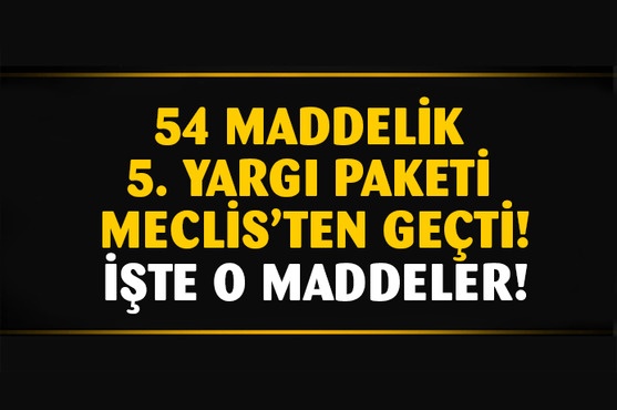 TBMM Adalet Komisyonu'nda, 8 kanunda değişiklik öngören, 54 maddeden oluşan 5'inci Yargı Paketi kabul edildi.,