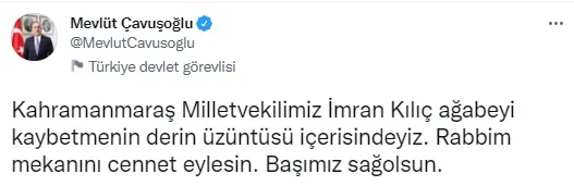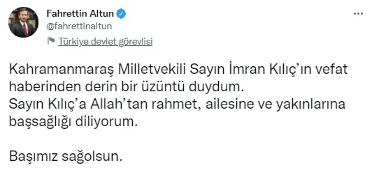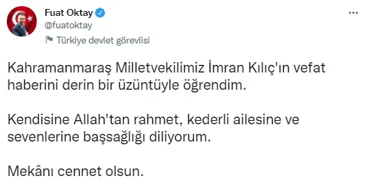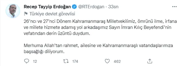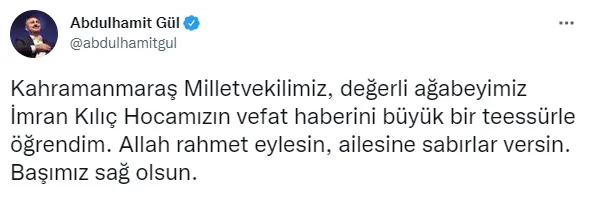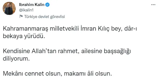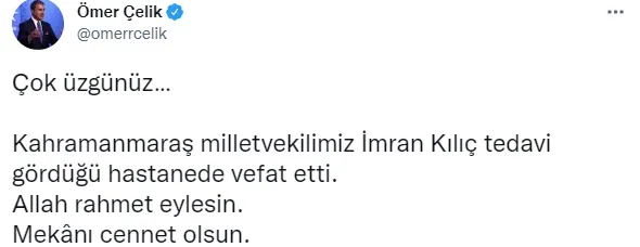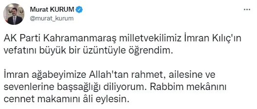 AK Parti Kahramanmaraş Milletvekili İmran Kılıç, tedavi gördüğü Ankara Şehir Hastanesi'nde hayatını kaybetti. Acı haberi, Sağlık Bakanı Fahrettin Koca, sosyal medya hesabından yaptığı paylaşımla duyurdu. AK Parti Milletvekili İmran Kılıç'ın vefatının ardından siyaset dünyasından çok sayıda isim başsağlığı mesajı paylaştı. Başkan Recep Tayyip Erdoğan da sosyal medya hesabından bir taziye mesajı yayınladı. Erdoğan, "Merhuma Allah’tan rahmet, ailesine ve Kahramanmaraşlı vatandaşlarımıza başsağlığı diliyorum." ifadelerine yer verdi.
