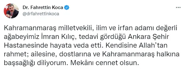 Sağlık Bakanı Fahrettin Koca, Twitter hesabından yaptığı paylaşımda, "Kahramanmaraş milletvekili, ilim ve irfan adamı değerli ağabeyimiz İmran Kılıç, tedavi gördüğü Ankara Şehir Hastanesinde hayata veda etti. Kendisine Allah'tan rahmet; ailesine, dostlarına ve Kahramanmaraş halkına başsağlığı diliyorum. Mekânı cennet olsun." ifadelerini kullandı.