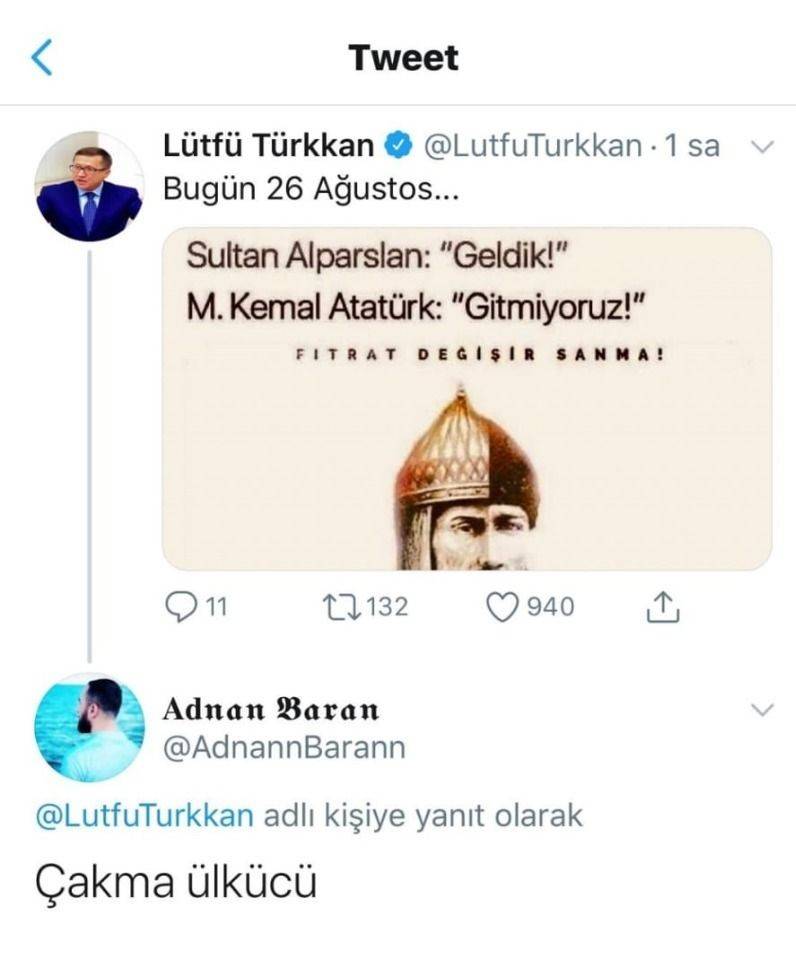 Türkkan kendisine "Çakma ülkücü" yazan bir başka sosyal medya kullancısı olan Adnan Baran isimli vatandaşa ağza alınmayacak ifadelerle cevap vermişti.