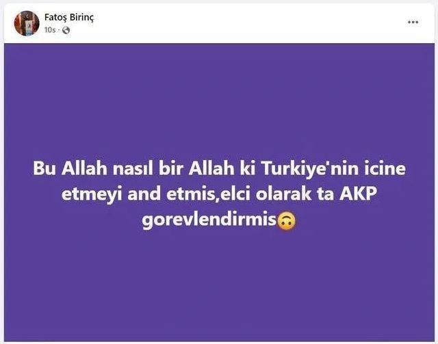 CHP Bursa Kadın Kolları eski Başkanı Fatoş Birinç, İslam'a ve Allah'a olan nefretini kustu. Sosyal medya hesabından yaptığı paylaşımda mukaddes değerlere hakaret eden Birinç, yaptığı paylaşımda şu ifadeleri kullandı: