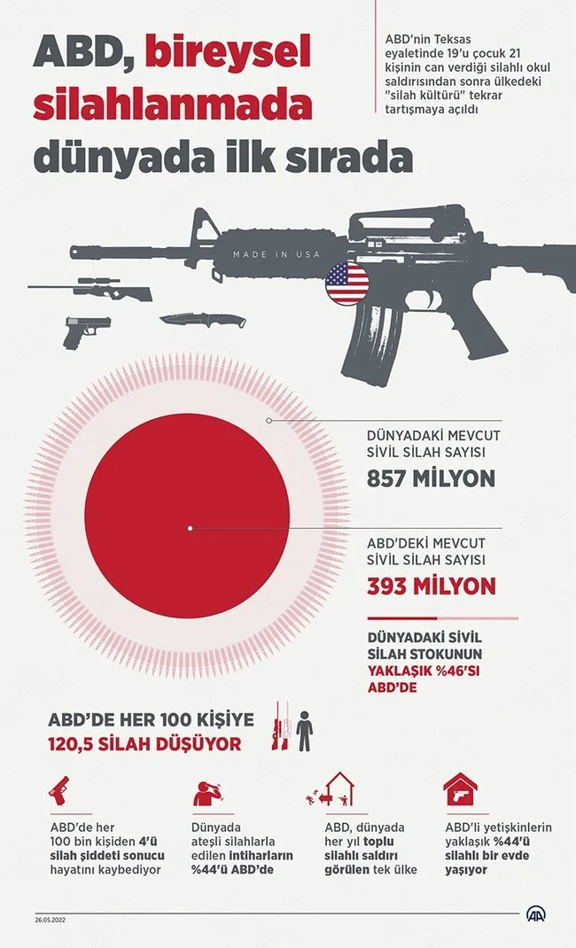 Haberde, ABD'nin dünyada sivillerin elinde bulunan silahların kişi sayısından fazla olduğu tek ülke olduğuna dikkat çekilerek, silaha sahip olma ve etkileri diğer ülkelerle grafik üzerinde karşılaştırılarak aktarıldı.