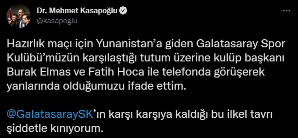 "Hazırlık maçı için Yunanistan'a giden Galatasaray Spor Kulübü'müzün karşılaştığı tutum üzerine kulüp başkanı Burak Elmas ve Fatih Hoca ile telefonda görüşerek yanlarında olduğumuzu ifade ettim.