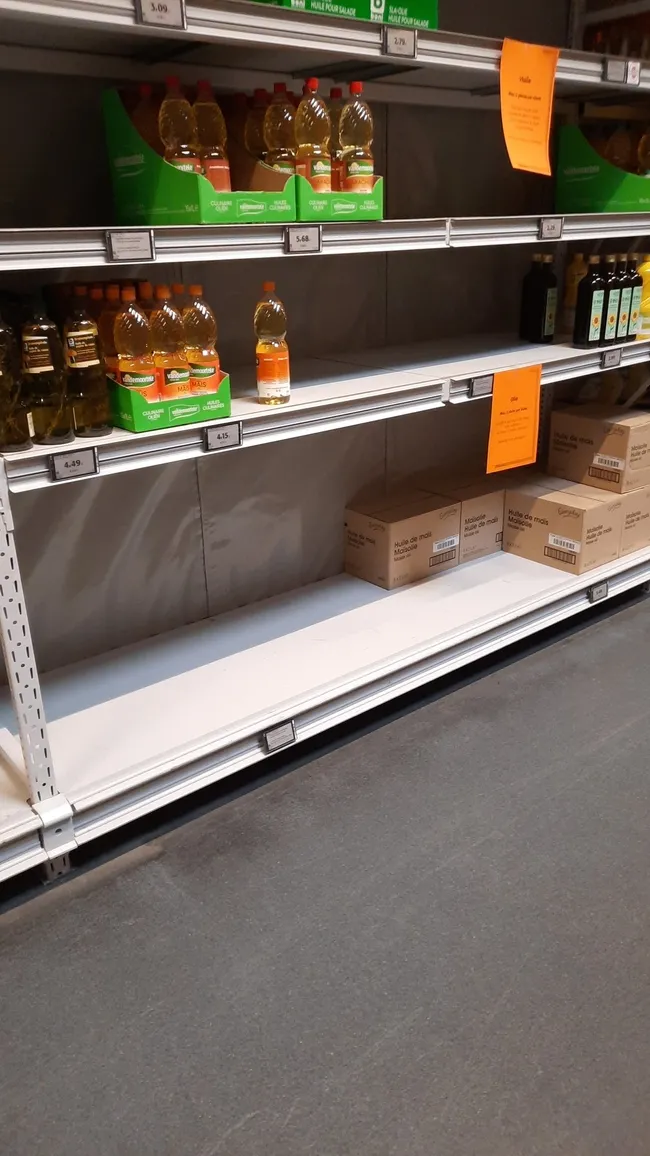 Aldi, yağ, un, buğday ve unlu karışımların satışını 3 adetle sınırlamaya başladı. Benzer biçimde Carrefour market zinciri de un ve yağ satışlarını kısıtladı. Kısıtlamalara rağmen marketlerde ayçiçeği yağı ve un bulunamıyor.