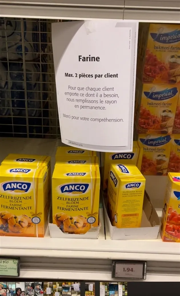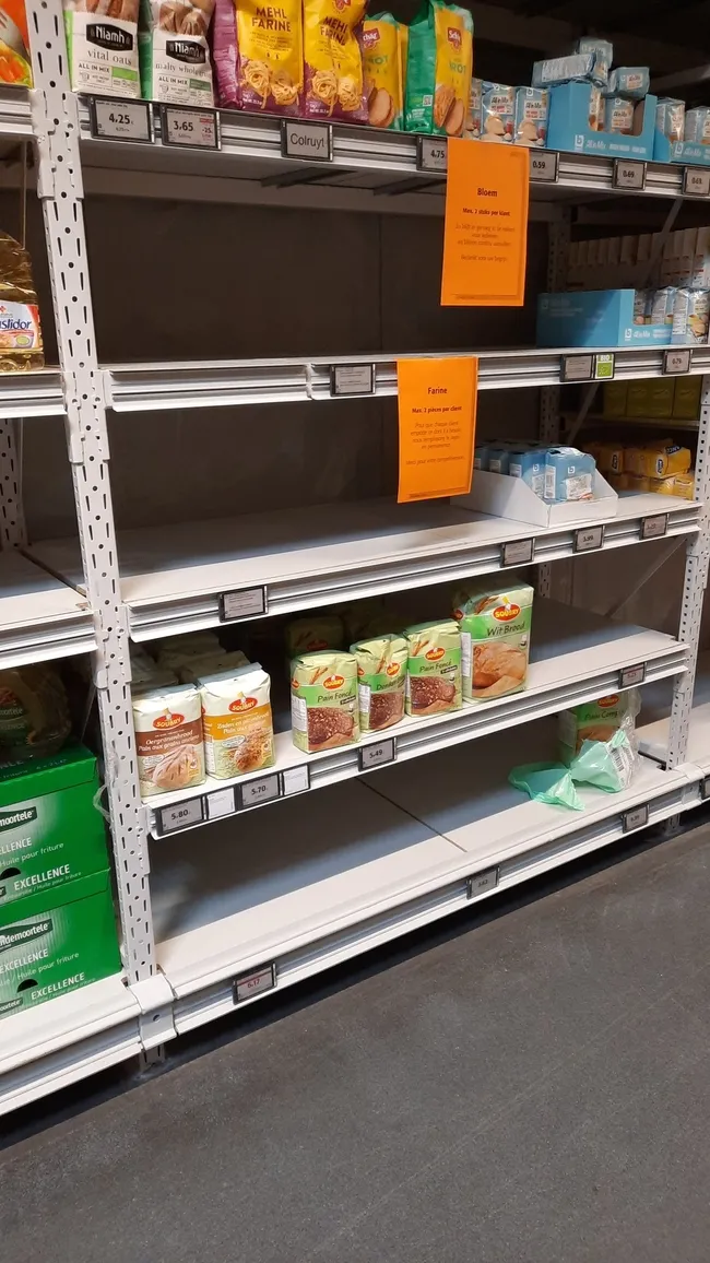 Ülkenin en büyük market zinciri Colruyt, cuma günü un ve yağ satışını kısıtlamıştı. Bu markette bir müşteriye en fazla 2 litre sıvı yağ ve 2 kilogram un satışına izin verilmeye başlamıştı.