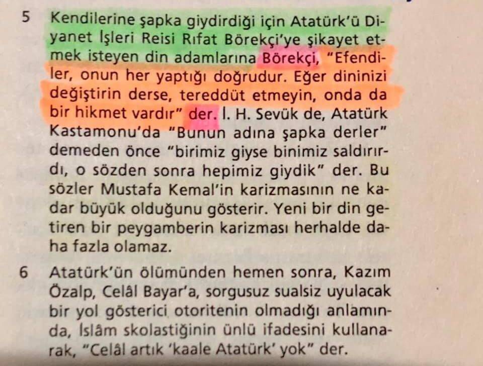 Kitapta aktarılan bilgilere göre Türkiye Cumhuriyeti'nin ilk Diyanet İşleri Başkanı Rıfat Börekçi’nin, şapka kanunu nedeniyle şapka takmaya zorlanan din adamlarının Mustafa Kemal’i kendilerine şikayet etmesi üzerine sarf ettiği sözler akıllara durgunluk getirir cinsten.