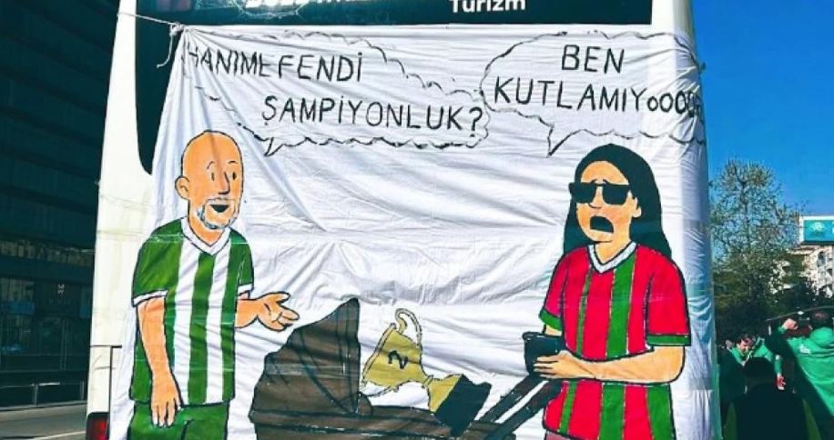 Otobüsün arkasına asılan bu pankartta Bursaspor'un ardından ikinci sırada yer alan ve doğrudan 2. Lig'e yükselme şansını kaçıran Karşıyaka'ya göndermede bulundu.