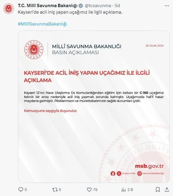 Bakanlıktan yapılan açıklamada, "Kayseri 12'nci Hava Ulaştırma Üs Komutanlığı'ndan eğitim için kalkan bir C-160 uçağımız teknik bir arıza nedeniyle acil iniş yapmak zorunda kalmıştır. Uçağımızda hafif hasar meydana gelmiştir. Pilotlarımızın ve mürettebatımızın sağlık durumları iyidir" denildi.