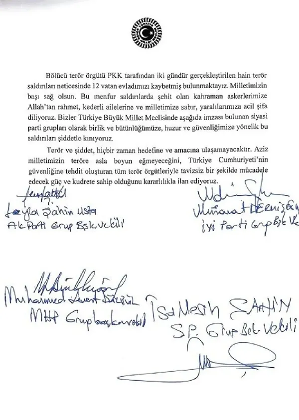 TBMM Genel Kurulunda Irak'ın kuzeyinde 12 askerin şehit olduğu terör saldırılarına yönelik "ortak bildiri" yayımlanması gündeme gelmişti. Her fırsatta HDPKK ile aynı masaya oturan ve yerel seçimler için ittifak yolunda yürüyen CHP'nin riyakarlığı bir kez daha gözler önüne serilmiş oldu. Kandil'in siyasi uzantısı HDPKK/DEM ve CHP skandal bir karara imza atarak, şehitlerimiz için yayımlanacak olan ortak bildiriye karşı çıkmıştı.