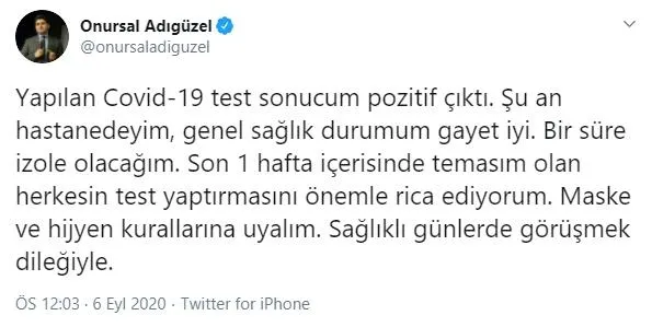 Yapılan Covid-19 test sonucum pozitif çıktı. Şu an hastanedeyim, genel sağlık durumum gayet iyi. Bir süre izole olacağım. Son 1 hafta içerisinde temasım olan herkesin test yaptırmasını önemle rica ediyorum. Maske ve hijyen kurallarına uyalım. Sağlıklı günlerde görüşmek dileğiyle.