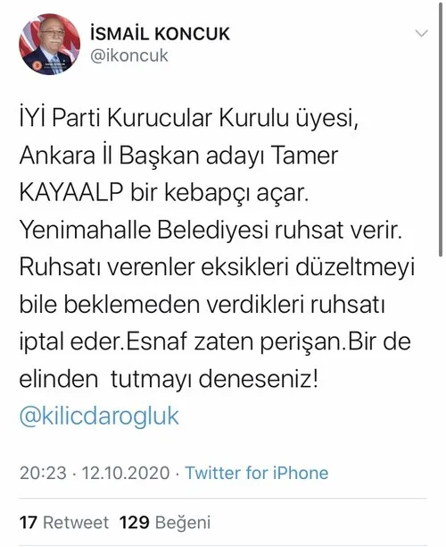 Koncuk; "İYİ Parti Kurucular Kurulu üyesi, Ankara İl Başkan adayı Tamer Kayaalp bir kebapçı açar. Yenimahalle Belediyesi ruhsat verir. Ruhsatı verenler eksikleri düzeltmeyi bile beklemeden verdikleri ruhsatı iptal eder. Esnaf zaten perişan.. Bir de elinden tutmayı deneseniz!" ifadelerini kullandı.