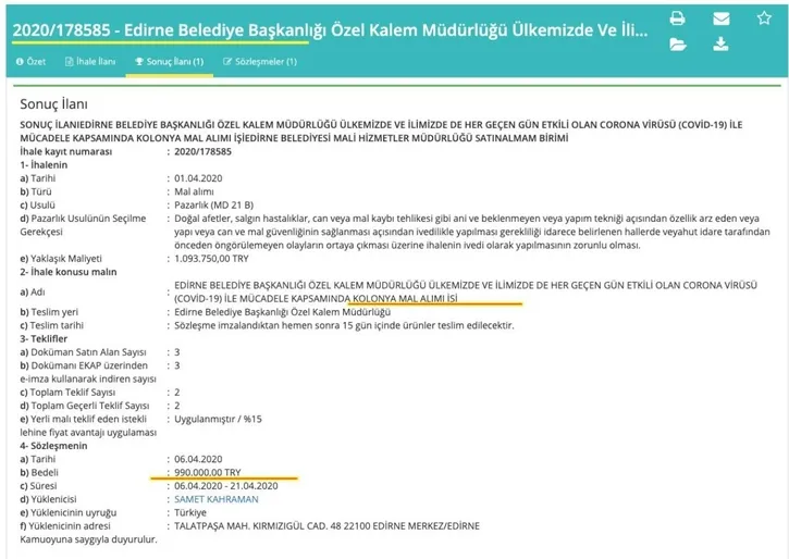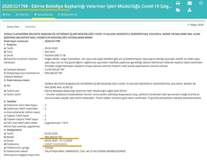 İlk ihale Edirne Belediyesi Özel Kalem Müdürlüğü tarafından sadece kolonya mal alımı için yapıldı. 1 Nisan 2020 tarihli 990 bin lira değerindeki bu ihaleyi CHP'li Edirne İl Başkanlığı yöneticisi Samet Kahraman aldı. Sözleşme 6 Nisan günü imzalandı.